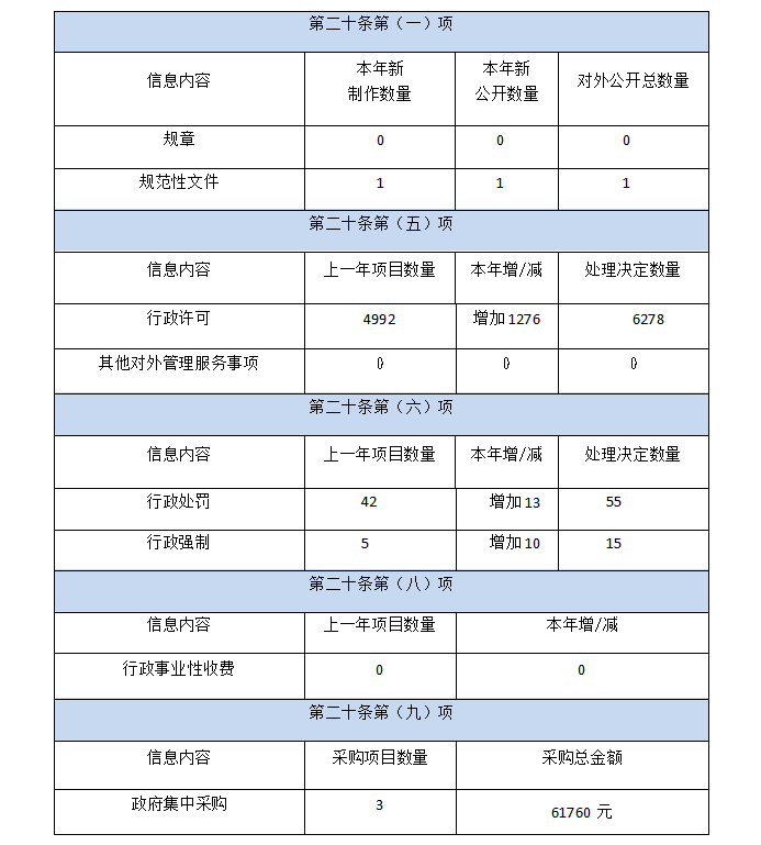 2019年度企業(yè)年報9917戶及企業(yè)年報信息雙隨機抽查工作(抽查企業(yè)年報信息396戶)結(jié)果在國家企業(yè)信息系統(tǒng)里全部公示。根據(jù)冬季大氣污染防治工作要求,落實煤質(zhì)抽檢結(jié)果公示,開展煤質(zhì)抽檢102批次,對煤炭經(jīng)銷主體、檢驗檢測機構(gòu)“雙隨機、一公開”抽查2次,檢查企業(yè)25家,抽檢結(jié)果在蘭州新區(qū)市場監(jiān)督管理局今日頭條公眾號、微信公眾號公開。開展“雙隨機、一公開”抽查,全年對經(jīng)營戶進行19批次、727戶抽查檢查,按照“誰檢查、誰錄入、誰公開”的原則,將檢查結(jié)果及時在甘肅省部門協(xié)同監(jiān)管平臺錄入并在國家企業(yè)信息系統(tǒng)公示,接受社會監(jiān)督。加強特種設備管理,在甘肅省特種設備作業(yè)人員考核管理平臺公示特種設備作業(yè)人員資格證核發(fā)信息538人次,在局微信公眾號、今日頭條發(fā)布特種設備作業(yè)人員考試機構(gòu)的公告、特種設備安全警示等13條(次)。落實助推企業(yè)實施蘭州新區(qū)商標品牌戰(zhàn)略實施工作,將符合激勵補助條件企業(yè)提交的87件注冊商標、1件國際注冊商標激勵補助在局微信公眾號公布予以公示。深入實施食品藥品安全戰(zhàn)略,營造放心經(jīng)營環(huán)境, “隴上食安”智慧監(jiān)管平臺接入438家單位1627臺設備,完成重大食品安全保障20余次,食品抽樣742批次結(jié)果在甘肅政務服務網(wǎng)蘭州新區(qū)網(wǎng)站公示。