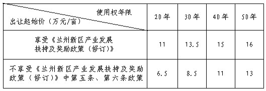 第七條 入駐產(chǎn)業(yè)園的企業(yè)可自主選擇是否享受《蘭州新區(qū)產(chǎn)業(yè)發(fā)展扶持及獎勵政策(修訂)》中第五條、第六條關(guān)于投資獎勵的優(yōu)惠政策,選擇不同供地價格,按下表執(zhí)行。