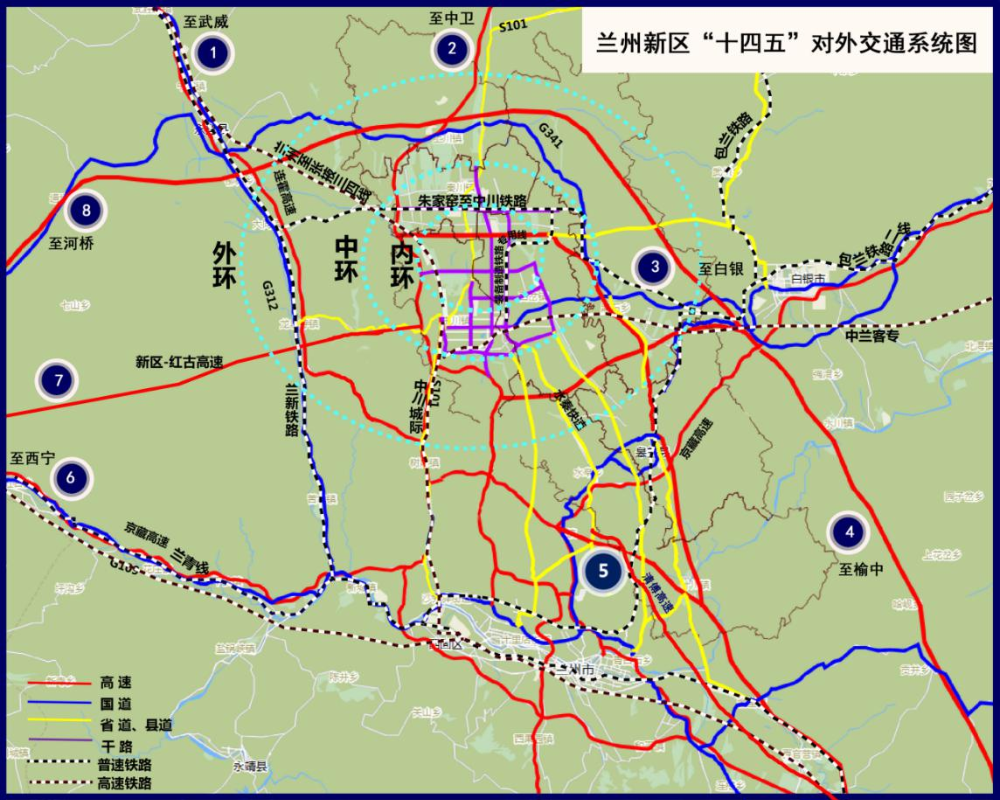提升新區(qū)鐵路樞紐地位。優(yōu)化鐵路干線網(wǎng)絡(luò),加快推進(jìn)中川城際鐵路提速改造,建成中蘭客專、蘭州-張掖三四線,籌劃建設(shè)蘭州市郊鐵路(軌道5號線)和客運(yùn)東環(huán)線,構(gòu)建“四縱兩橫一環(huán)線”鐵路骨架路網(wǎng)(四條縱線:中川城際鐵路和蘭州-張掖三四線、市郊鐵路(軌道5號線)、包蘭鐵路、客運(yùn)東環(huán)線;兩條橫線:中馬朱中鐵路、中蘭客專;一環(huán):機(jī)場鐵路環(huán)線)。建成新區(qū)南站,改建蘭州新區(qū)站、中川機(jī)場站,完善配套建設(shè),形成機(jī)場T2站、T3站、蘭州新區(qū)站、新區(qū)南站四個綜合交通樞紐場站。加快推動中馬、朱中鐵路并入國家鐵路網(wǎng),提升鐵路貨運(yùn)水平。