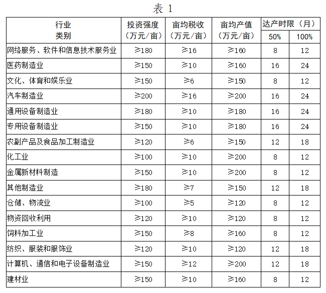 在項(xiàng)目準(zhǔn)入階段,將用地規(guī)模、固定資產(chǎn)投資額、投資強(qiáng)度、畝均產(chǎn)值、畝均稅收、畝均就業(yè)人數(shù)、容積率、建設(shè)周期、達(dá)產(chǎn)時(shí)限等指標(biāo)納入《招商引資合同》,作為項(xiàng)目實(shí)施過程的獎(jiǎng)懲依據(jù),并在《使用權(quán)出讓合同》中明確約定項(xiàng)目開工日期,在約定開工日期后3個(gè)月內(nèi)開工建設(shè),主要控制性指標(biāo)按照表1執(zhí)行。