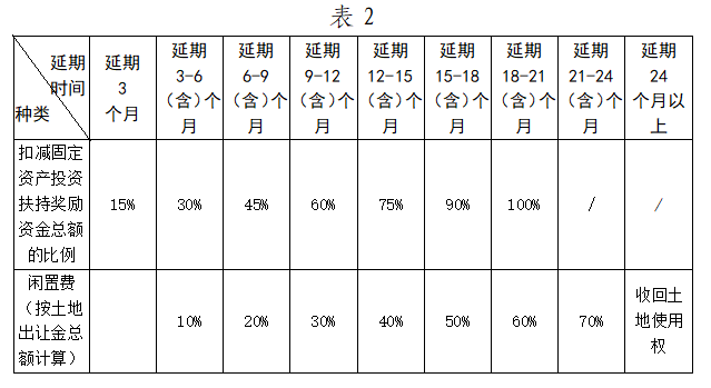 約定開工日期后項(xiàng)目必須及時(shí)開工建設(shè),且持續(xù)施工,若項(xiàng)目延期開工,按照表2確定的比例扣減獎(jiǎng)勵(lì)扶持資金并繳納土地閑置費(fèi)。超過約定動工時(shí)間滿2年仍未開工的,收回土地使用權(quán)。