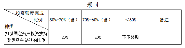 ?。ǘ┩瓿身?xiàng)目約定的建設(shè)內(nèi)容,但投資強(qiáng)度未達(dá)到《招商引資合同》約定的,根據(jù)實(shí)際完成投資額比例,按照表4扣減扶持獎(jiǎng)勵(lì)資金。