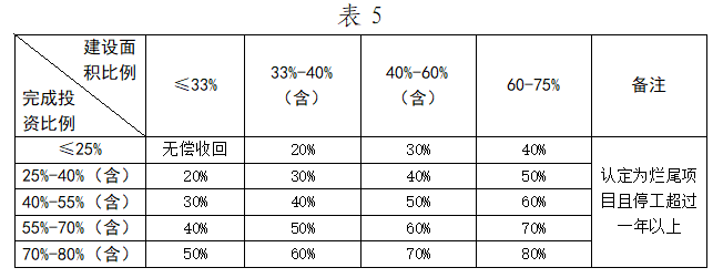 ?。ㄈ╉?xiàng)目按期開工,對開發(fā)建設(shè)面積超過三分之一或者投資額占總投資額超過25%,但停工超過一年以上且超過約定竣工時(shí)間造成爛尾的項(xiàng)目,無償收回土地使用權(quán)。對地上建構(gòu)筑物經(jīng)評估可再次利用的,根據(jù)建構(gòu)筑物決算審計(jì)結(jié)果,最高補(bǔ)償不得超過審計(jì)結(jié)果的80%。各類設(shè)備或可移動、拆除的建筑材料等,由項(xiàng)目單位自行清理,不予補(bǔ)償。補(bǔ)償比例根據(jù)建設(shè)面積和完成投資對應(yīng)關(guān)系按照表5執(zhí)行。