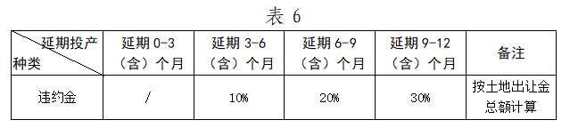 項(xiàng)目工程已竣工驗(yàn)收但3個(gè)月后仍未投產(chǎn)的,收取土地使用違約金,違約金比例按照表6標(biāo)準(zhǔn)執(zhí)行。
