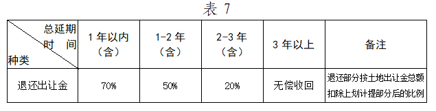 連續(xù)一年及以上不投產(chǎn)的項(xiàng)目,收回土地使用權(quán),涉及的土地出讓金根據(jù)竣工后拖延投產(chǎn)時(shí)間,按表7確定的比例退還。