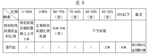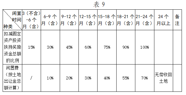 (一)閑置用地項(xiàng)目。對超過約定開工時(shí)間3個(gè)月的,按照表9確定的比例扣減扶持獎(jiǎng)勵(lì)資金,并征收土地閑置費(fèi)。無償收回土地使用權(quán)的,地上建構(gòu)筑物不予補(bǔ)償,并追繳已兌現(xiàn)的扶持獎(jiǎng)勵(lì)資金及其他專項(xiàng)資金。