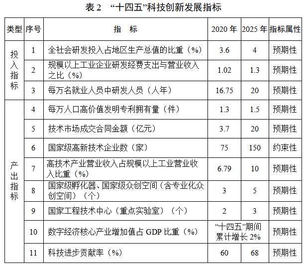 ——科技創(chuàng)新生態(tài)更加優(yōu)化。構(gòu)建系統(tǒng)創(chuàng)新、協(xié)同創(chuàng)新、開放創(chuàng)新的科技創(chuàng)新體系,政策配套更加健全,創(chuàng)新服務(wù)便捷普惠,創(chuàng)新效能顯著提升,信息經(jīng)濟不斷壯大,形成全社會崇尚創(chuàng)新的濃厚氛圍。到2025年,技術(shù)市場成交合同金額20億元、科技進步貢獻率達到68%;“十四五”期間數(shù)字經(jīng)濟核心產(chǎn)業(yè)增加值占GDP比重累計增長2%。