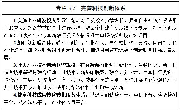3.完善科技創(chuàng)新體系。構(gòu)建以產(chǎn)品確定創(chuàng)新的科技供給體系,引導(dǎo)科研機構(gòu)對接新區(qū)企業(yè)技術(shù)需求布局科研項目,增強企業(yè)技術(shù)研發(fā)、技術(shù)應(yīng)用及技術(shù)整合能力,提升企業(yè)產(chǎn)品競爭力。健全科技成果轉(zhuǎn)移轉(zhuǎn)化服務(wù)體系,完善科技成果評估交易與轉(zhuǎn)化績效獎勵機制。支持行業(yè)骨干企業(yè)牽頭組建體系化、任務(wù)型的創(chuàng)新聯(lián)合體和產(chǎn)業(yè)技術(shù)創(chuàng)新聯(lián)盟,集聚行業(yè)上下游中小企業(yè)創(chuàng)新要素和高校院所科研力量,聯(lián)合開展重大關(guān)鍵技術(shù)、前沿技術(shù)研發(fā),促進新技術(shù)新產(chǎn)品新工藝產(chǎn)業(yè)化、規(guī)?;瘧?yīng)用,推動產(chǎn)業(yè)鏈供應(yīng)鏈創(chuàng)新鏈升級。支持企業(yè)建設(shè)院士專家工作站,逐步建立起院士專家與設(shè)站企業(yè)協(xié)作的長效服務(wù)機制。實施企業(yè)研發(fā)平臺創(chuàng)新能力提升計劃,鼓勵建有研發(fā)機構(gòu)的企業(yè)主動承擔(dān)國家、省、市科技專項,與高校院所開展校企合作,聯(lián)合開展技術(shù)研發(fā),突破一批具有自主知識產(chǎn)權(quán)的技術(shù)和產(chǎn)品。用好甘肅省科學(xué)技術(shù)獎對企業(yè)技術(shù)創(chuàng)新的引導(dǎo)激勵作用。
