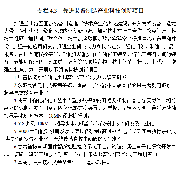 4.拓展創(chuàng)新發(fā)展新空間。立足蘭州新區(qū)在大科學(xué)裝置、特色產(chǎn)業(yè)、科教資源等方面的基礎(chǔ),加快培育以同位素實驗室、超高溫釷基熔鹽泵閥試驗平臺、硅立方超算中心等為代表的國家戰(zhàn)略科技力量,支撐國家重大戰(zhàn)略實施、服務(wù)國家安全體系建設(shè),努力把蘭州新區(qū)打造成為蘭州國家區(qū)域科技創(chuàng)新中心“核心承載區(qū)”,夯實蘭州新區(qū)在全省科技創(chuàng)新體系中的地位。深化產(chǎn)學(xué)研合作、產(chǎn)教融合,引進蘭州大學(xué)、蘭州理工大學(xué)、甘肅農(nóng)業(yè)大學(xué)等高校在新區(qū)設(shè)立成果轉(zhuǎn)化基地。鼓勵企業(yè)與院校合作建立校企合作育人新機制,支持學(xué)校和企業(yè)成立工作室、實驗室、創(chuàng)新基地、創(chuàng)客中心、產(chǎn)業(yè)學(xué)院、實訓(xùn)基地等,建立產(chǎn)教融合人才儲備庫和校企合作項目庫,促進教育鏈、人才鏈與產(chǎn)業(yè)鏈、創(chuàng)新鏈有效銜接。加快推進蘭州新區(qū)國家裝備制造高新技術(shù)產(chǎn)業(yè)化基地建設(shè),實施一批成長性好、帶動力強的裝備制造領(lǐng)域科技創(chuàng)新項目,推動能源化工裝備、重離子醫(yī)療裝備、海洋工程裝備、節(jié)能環(huán)保裝備科技創(chuàng)新成果轉(zhuǎn)移轉(zhuǎn)化。