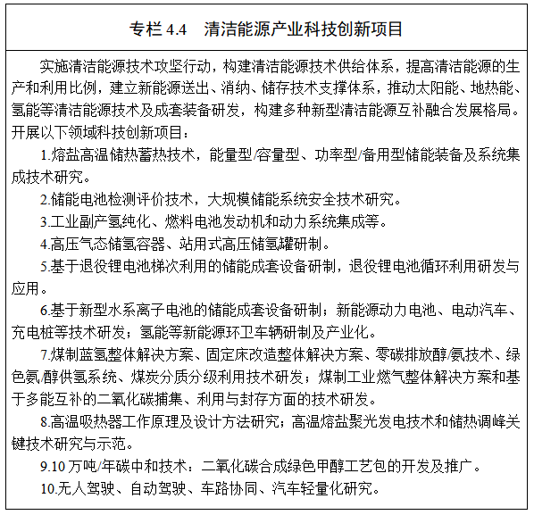 2.科技支撐清潔能源產(chǎn)業(yè)發(fā)展。圍繞“整車—電池電機電控—充換電設(shè)備—試驗檢測”等新能源汽車產(chǎn)業(yè)鏈,加大對動力電池、儲能電站、充電設(shè)施、氫能儲運等技術(shù)研發(fā)和成果轉(zhuǎn)化的支持力度,開展驅(qū)動電機、電控系統(tǒng)、車用附件等核心關(guān)鍵部件研發(fā)和技術(shù)引進,形成相對完善的新能源汽車產(chǎn)業(yè)技術(shù)創(chuàng)新鏈。在氫能產(chǎn)業(yè)領(lǐng)域,依托全球首套千噸級太陽燃料合成:二氧化碳加氫合成甲醇工業(yè)化示范項目、首航高科能源等企業(yè),開展氫能和氫燃料電池汽車技術(shù)研發(fā),推動制氫、儲氫、運氫、加氫、用氫方向的發(fā)展。發(fā)展新能源裝備與技術(shù),研發(fā)太陽能光伏/光熱裝備、釷基核能系統(tǒng)儲能用超高溫熔鹽泵、太陽能發(fā)電技術(shù)及裝備、高可靠性全天發(fā)電的太陽能熱發(fā)電系統(tǒng)集成技術(shù)及關(guān)鍵設(shè)備、高溫吸熱工質(zhì)、儲能與儲熱材料及系統(tǒng)、新型反光材料及低成本反射鏡等,形成具有特色的產(chǎn)業(yè)集群和較為完整的產(chǎn)業(yè)鏈。加快開展中深層地?zé)衢_采利用、余熱回收利用、多能互補清潔取暖技術(shù)研發(fā),推動新區(qū)能源清潔化發(fā)展。在儲能產(chǎn)業(yè)領(lǐng)域,以電化學(xué)儲能、氫儲能、熔鹽儲能技術(shù)為支撐,開展多種儲能技術(shù)、成套裝備之間的融合及差異化集成開發(fā)。