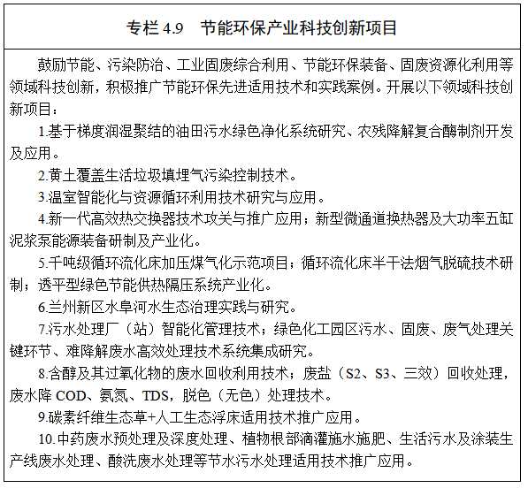 4.科技支撐節(jié)能環(huán)保產(chǎn)業(yè)發(fā)展。加強節(jié)能環(huán)保、污染防治、工業(yè)固廢綜合利用等重點領(lǐng)域關(guān)鍵技術(shù)研發(fā),發(fā)展高效節(jié)能、資源循環(huán)利用、大氣治理、污水處理等先進技術(shù)和專業(yè)化服務(wù)。支持蘭石集團大力發(fā)展節(jié)能環(huán)保裝備,建設(shè)節(jié)能環(huán)保裝備制造產(chǎn)業(yè)基地。培育壯大節(jié)能電氣設(shè)備、環(huán)保技術(shù)設(shè)備、資源綜合利用設(shè)備、再制造和節(jié)水設(shè)備研發(fā)制造等產(chǎn)業(yè)。鼓勵新區(qū)制造業(yè)企業(yè)加大節(jié)能環(huán)保技術(shù)和產(chǎn)品研發(fā)力度,加強新型節(jié)能電機、余熱余壓綜合回收利用、工業(yè)過程節(jié)能、建筑節(jié)能等領(lǐng)域關(guān)鍵技術(shù)研發(fā),加快高效蓄熱、換熱、冷卻、干燥技術(shù)和裝備研發(fā)示范。加強與高??蒲性核a(chǎn)學(xué)研合作,對化工園區(qū)污水、固廢處理中的關(guān)鍵環(huán)節(jié)領(lǐng)域進行研究,保障園區(qū)高質(zhì)量快速度發(fā)展,為產(chǎn)業(yè)集聚發(fā)展賦能加力。積極引導(dǎo)省內(nèi)科研院所、高等院校、污水處理企業(yè)等開展污水深度處理、污泥資源化利用共性和關(guān)鍵技術(shù)研發(fā),引導(dǎo)企業(yè)使用國家鼓勵的工業(yè)節(jié)水工藝、技術(shù)和裝備,提升水循環(huán)利用水平。