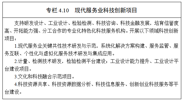 5.科技支撐現(xiàn)代服務(wù)業(yè)發(fā)展。推動生產(chǎn)性服務(wù)業(yè)向?qū)I(yè)化和價值鏈高端延伸,強化現(xiàn)代服務(wù)業(yè)關(guān)鍵共性技術(shù)突破,支持研發(fā)設(shè)計、工業(yè)設(shè)計、檢驗檢測、科技咨詢、科技金融發(fā)展,促進現(xiàn)代服務(wù)業(yè)與農(nóng)業(yè)、工業(yè)、文化旅游等領(lǐng)域有機融合,實現(xiàn)科技服務(wù)精準(zhǔn)化。推進創(chuàng)新創(chuàng)業(yè)服務(wù)體系建設(shè),培育一批信譽度高、開拓能力強、分工合作的專業(yè)化、特色化科技服務(wù)機構(gòu)。加強計量、檢測技術(shù)等基礎(chǔ)能力建設(shè),發(fā)展面向設(shè)計開發(fā)、生產(chǎn)制造的分析、測試、檢驗、標(biāo)準(zhǔn)、認證等服務(wù)。加強知識產(chǎn)權(quán)服務(wù),大力發(fā)展知識產(chǎn)權(quán)代理、法律、信息、咨詢、培訓(xùn)等機構(gòu),提升知識產(chǎn)權(quán)評估交易、保護維權(quán)、投融資等服務(wù)水平。依托綠色金融改革試驗區(qū)建立科技金融服務(wù)體系,開展科技保險、科技擔(dān)保、知識產(chǎn)權(quán)質(zhì)押等科技金融服務(wù)。