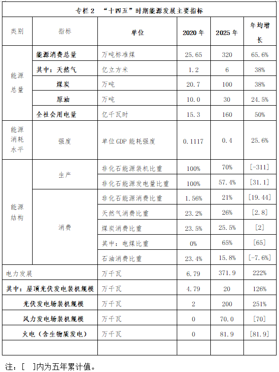 2.能源結(jié)構(gòu)不斷優(yōu)化。圍繞能源資源稟賦和發(fā)展條件,推動(dòng)風(fēng)光火儲(chǔ)為一體的綜合能源島建設(shè)。到2025年,可再生能源裝機(jī)容量從2020年6.79萬(wàn)千瓦增長(zhǎng)至290萬(wàn)千瓦,綠色能源消費(fèi)占比從2020年1.56%增長(zhǎng)至21%,能源生產(chǎn)裝機(jī)規(guī)模總發(fā)電量81.7億千瓦時(shí),基本形成風(fēng)光互補(bǔ)、火電參與、需求側(cè)調(diào)控的能源格局。