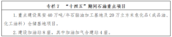 (三)推動(dòng)油氣供應(yīng)體系建設(shè)。積極推進(jìn)原有加油站升級(jí)改造,確保完成國(guó)六油品替代,依托現(xiàn)有儲(chǔ)油基地,加強(qiáng)儲(chǔ)油氣庫(kù)等基礎(chǔ)設(shè)施建設(shè),積極爭(zhēng)取國(guó)家能源局、省發(fā)展改革委在蘭州新區(qū)增設(shè)500萬(wàn)立方米儲(chǔ)油基地,拓展與石油相關(guān)產(chǎn)業(yè)鏈發(fā)展。“十四五”期間,規(guī)劃建設(shè)加油站8座,加油加氣合建站4座,保障蘭州新區(qū)油氣供應(yīng)能力。