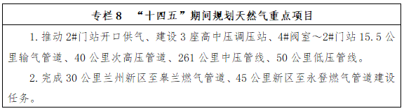 (二)大力開(kāi)發(fā)城鎮(zhèn)燃?xì)饨ㄔO(shè)。完成蘭州新區(qū)至皋蘭縣城、永登縣城的天然氣管道建設(shè),實(shí)現(xiàn)與縣城內(nèi)天然氣管道形成互連互通;保留村管網(wǎng)覆蓋率達(dá)50%以上,在天然氣管網(wǎng)覆蓋不到的村落積極配套建設(shè)瓶裝氣、LNG氣源站等燃?xì)庠O(shè)施。