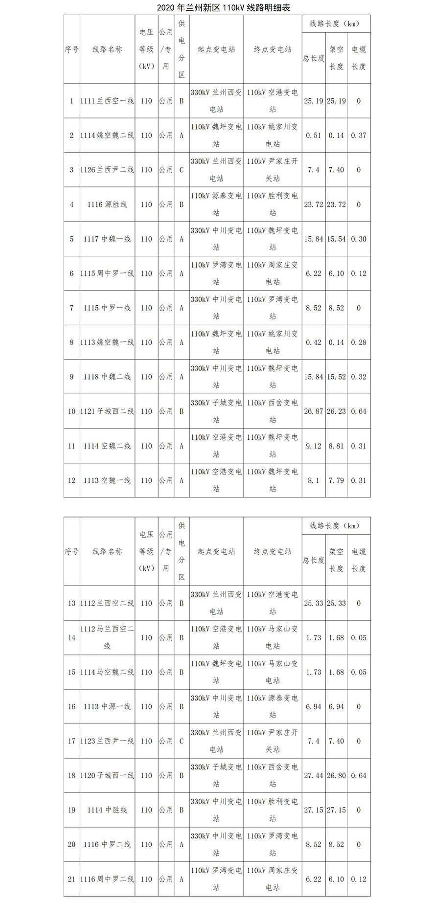 截至2020年底,蘭州新區(qū)共有110kV公用線路21條,線路全長260.21km,其中架空線路長度256.7km,電纜線路長度3.51km。110kV線路情況如下表所示: