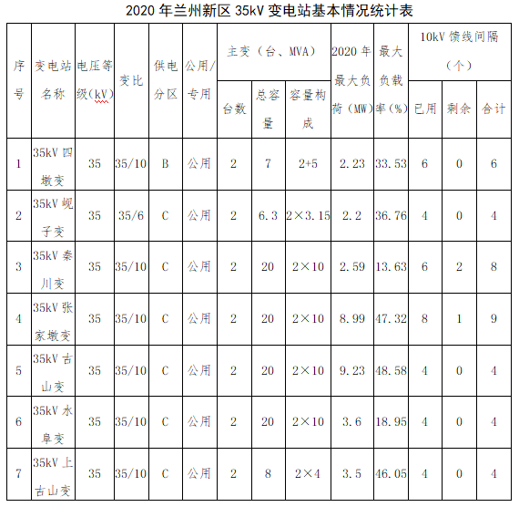 截至2020年底,蘭州新區(qū)共有35kV公用變電站7座,主變14臺(tái),容量101.3MW,10(6)kV出線間隔總數(shù)39個(gè),已用32個(gè),剩余7個(gè),10(6)kV間隔利用率82.05%。35kV變電站情況如下表所示: