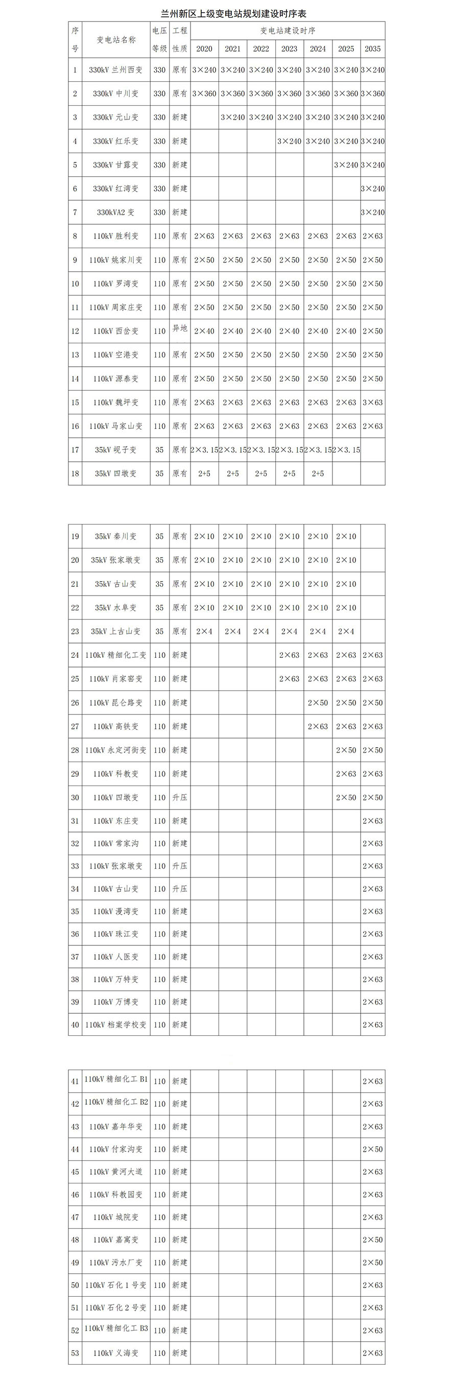 1.35kV及以上電網(wǎng)規(guī)劃建設(shè)時(shí)序。“十四五”期間,蘭州新區(qū)共計(jì)新建330kV變電站3座,總?cè)萘?160MW;110kV變電站7座,總?cè)萘?04MW。至2025年,蘭州新區(qū)共有330kV變電站5座;總?cè)萘?960MW,110kV變電站16座,總?cè)萘?845MW;35kV變電站6座,總?cè)萘?4.3MW。至2035年,蘭州新區(qū)將有330kV變電站7座,總?cè)萘?400MW;110kV變電站39座,總?cè)萘?665MW。