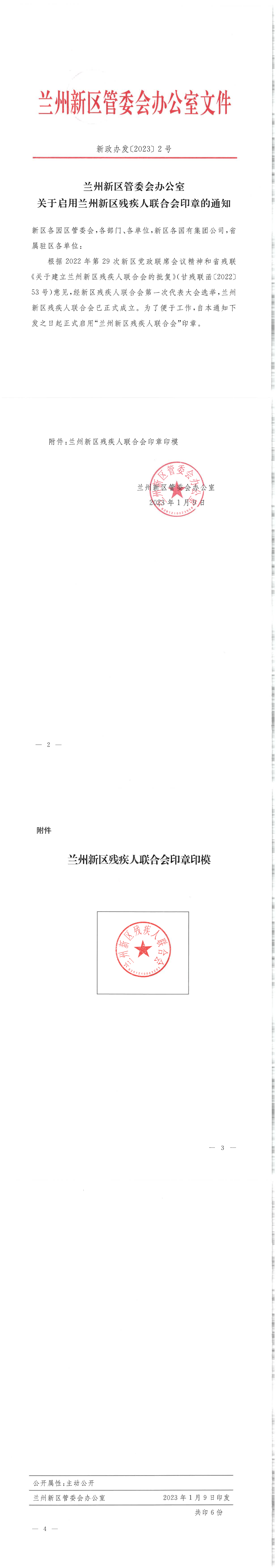 相關(guān)文件:《蘭州新區(qū)管委會(huì)辦公室關(guān)于啟用蘭州新區(qū)殘疾人聯(lián)合會(huì)印章的通知》(新政辦發(fā)〔2023〕2號(hào))