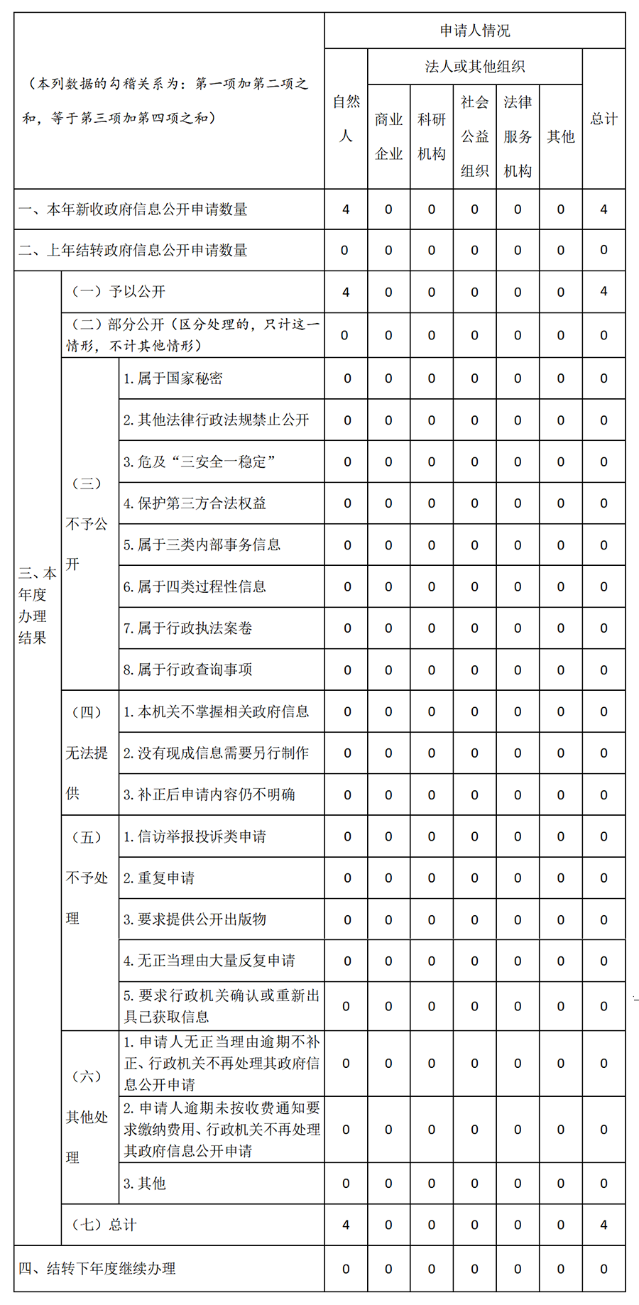 ?。ǘ┮郎暾埞_情況。全年收到4件依申請公開事項(xiàng),已全部按照申請獲取信息方式,及時(shí)予以回復(fù)。