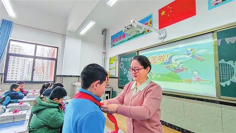 老師給學(xué)生佩戴紅領(lǐng)巾。