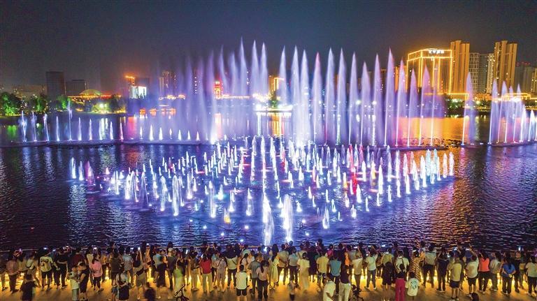 棲霞湖音樂(lè)噴泉表演震撼亮相,吸引游客和市民駐足欣賞