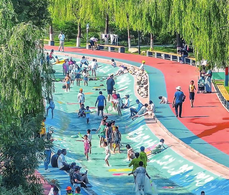 盛夏時節(jié),陽光慷慨傾灑,秦王川國家濕地公園沐浴在斑斕色彩之中,一幅水天一色、綠蔭如織、鳥語花香的景象。百花公園則是綠樹成蔭、百花齊放。公園彩繪淺水區(qū)還能劃船、戲水,是孩子們的快樂天堂。