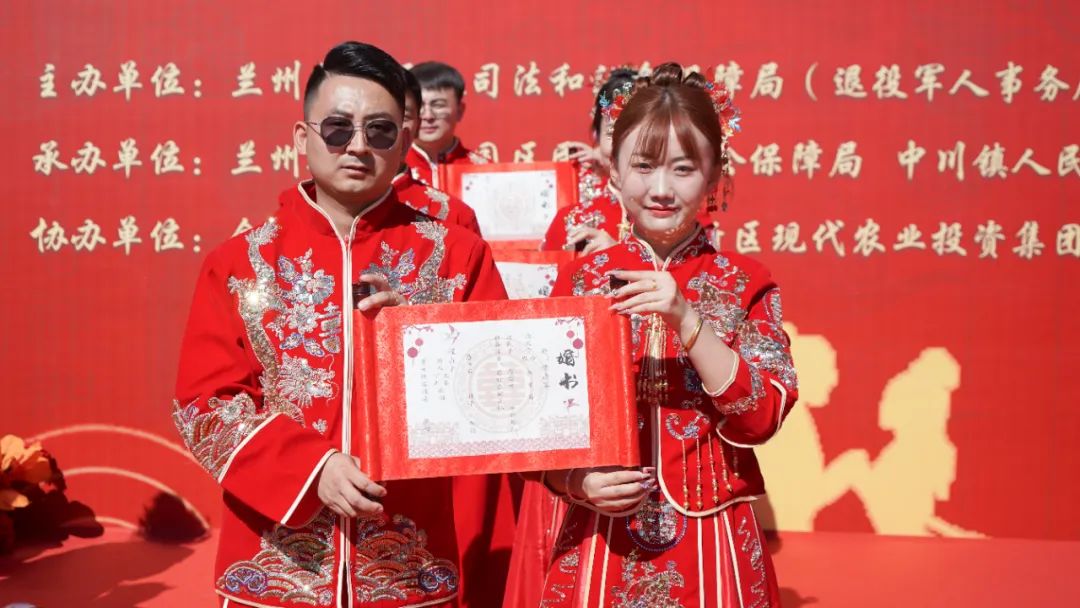 早上8時許,20對新人前往新區(qū)史喇口鄉(xiāng)村旅游區(qū)參加由新區(qū)民政司法和社會保障局(退役軍人事務(wù)局)、中川園區(qū)管委會主辦,中川園區(qū)民政和社會保障局、中川鎮(zhèn)人民政府、新區(qū)婚姻登記處承辦的集體婚禮和頒證儀式。在充滿喜慶溫情氛圍的青云驛露營草坪婚禮現(xiàn)場,頒證嘉賓和金婚夫婦代表為18對新人頒發(fā)結(jié)婚證書并贈送鮮花,新婚夫婦集體誦讀《蘭州新區(qū)婚俗改革倡議書》后,還舉行了中式婚禮儀式。