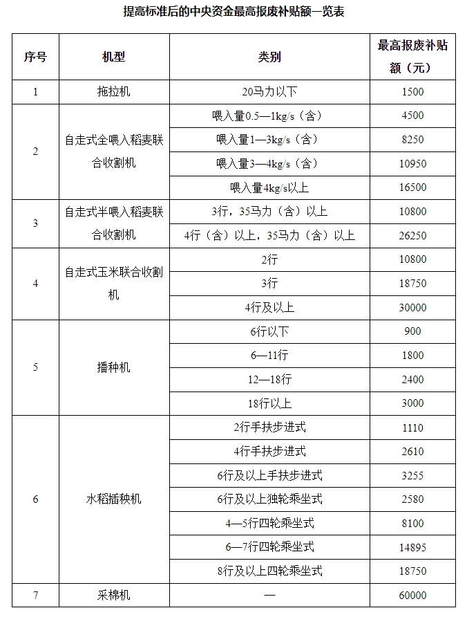 報廢20馬力以下拖拉機,單臺最高報廢補貼額由1000元提高到1500元;報廢聯(lián)合收割機、水稻插秧機、播種機并新購置同種類機具,按不超過50%提高報廢補貼標(biāo)準(zhǔn),單臺最高報廢補貼額不超過3萬元;報廢并更新購置采棉機,單臺最高報廢補貼額由3萬元提高到6萬元(詳見附件)。除20馬力以下拖拉機外,對只申請報廢不新購置的,繼續(xù)執(zhí)行《通知》規(guī)定的報廢補貼標(biāo)準(zhǔn)。對自《通知》印發(fā)之日起提交報廢補貼申請的,按調(diào)整后的報廢補貼標(biāo)準(zhǔn)執(zhí)行,對已領(lǐng)取報廢補貼的,補齊差額部分補貼。