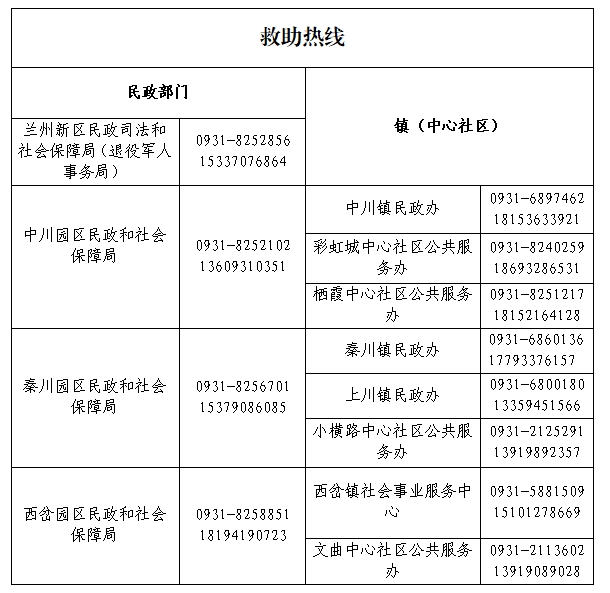 為切實維護生活無著流浪乞討人員基本權(quán)益,確保其得到及時救助,現(xiàn)將蘭州新區(qū)生活無著流浪乞討人員救助熱線通告如下: