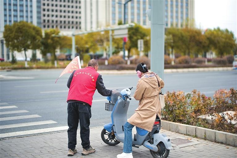 志愿者勸導(dǎo)電動自行車駕駛?cè)舜骱冒踩^盔。