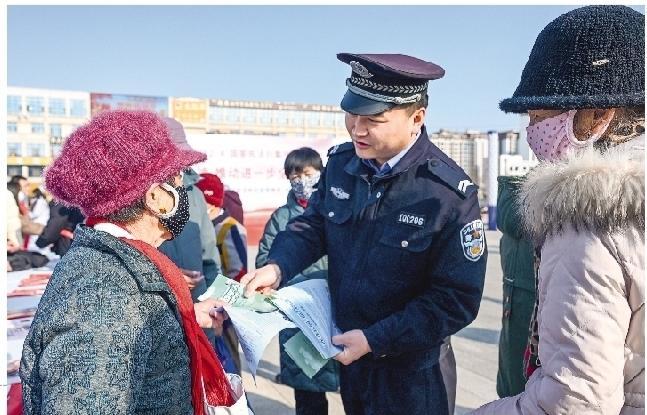 蘭州新區(qū)公安民警在宣傳活動現(xiàn)場向群眾普及憲法知識并發(fā)放普法宣傳冊