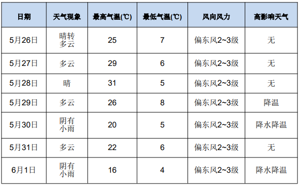 預(yù)計(jì)26日,受弱冷空氣影響,新區(qū)云量較多;27至28日,轉(zhuǎn)為西北氣流控制,新區(qū)天氣晴或多云,午后氣溫較高;29至6月1日,受波動(dòng)氣流影響,新區(qū)云量增多,氣溫下降,其中30日及6月1日新區(qū)陰有小雨。