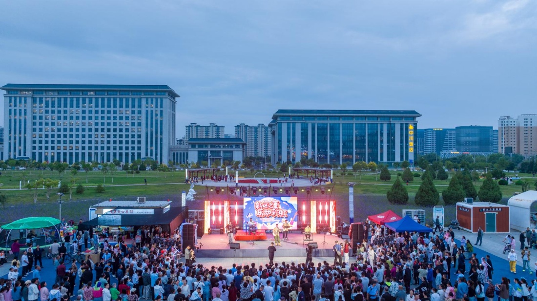 7月24日晚8時,彩虹城中心社區(qū)“新區(qū)之夏·樂動彩虹”大合唱活動在中川體育公園廣場啟幕。