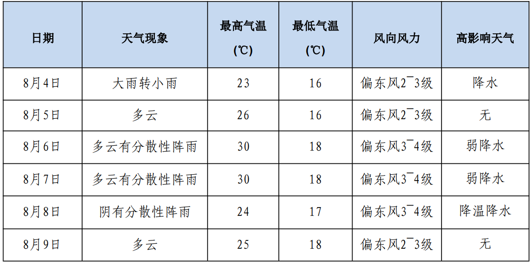 2.8月6日至8月8日,新區(qū)多分散性陣雨天氣,請(qǐng)廣大市民外 出攜帶雨具,注意道路濕滑和能見度降低對(duì)交通的影響,注意安全。