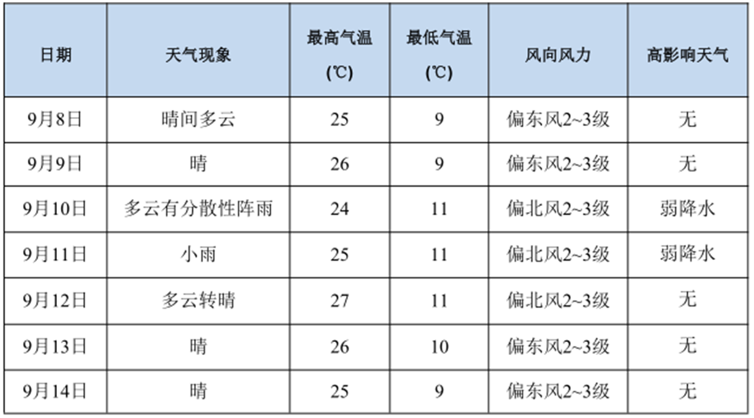 9月8至9日,受偏西氣流影響,新區(qū)天氣以晴為主;10日白天,受切變線影響,新區(qū)有分散性陣雨;11日,受副熱帶高壓影響,新區(qū)有降水天氣;12至14日,受西北氣流影響,新區(qū)天氣轉(zhuǎn)晴。